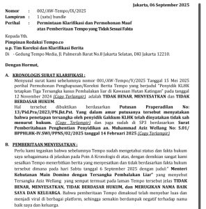 “Kami memohon kepada Tempo untuk memberikan waktu 2×24 jam sejak surat ini diterima guna menyampaikan klarifikasi resmi dan permohonan maaf secara terbuka,” tulis Aziz Wellang Sabtu (6/9/2025).