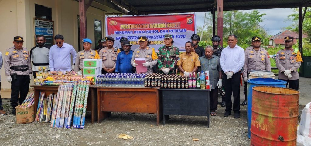MDI NEWS INDRAMAYU, Yahukimo – Dalam rangka menyambut tahun baru 2024 dan menjaga keamanan serta ketertiban masyarakat, Kodim 1715/Yahukimo dan Polres Yahukimo bersama jajaran Pemda Yahukimo, tokoh agama, dan tokoh adat setempat melakukan aksi pemusnahan minuman keras hasil dari patroli gabungan. Kegiatan ini dilaksanakan di halaman kantor Polres Yahukimo dan dihadiri oleh berbagai elemen masyarakat.